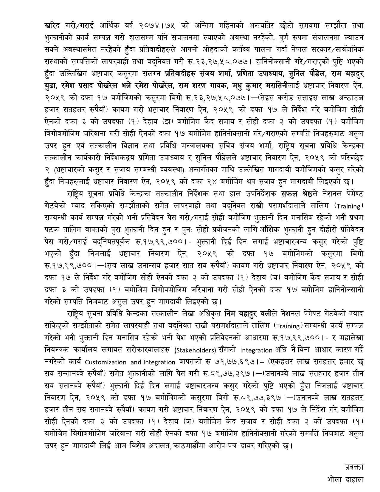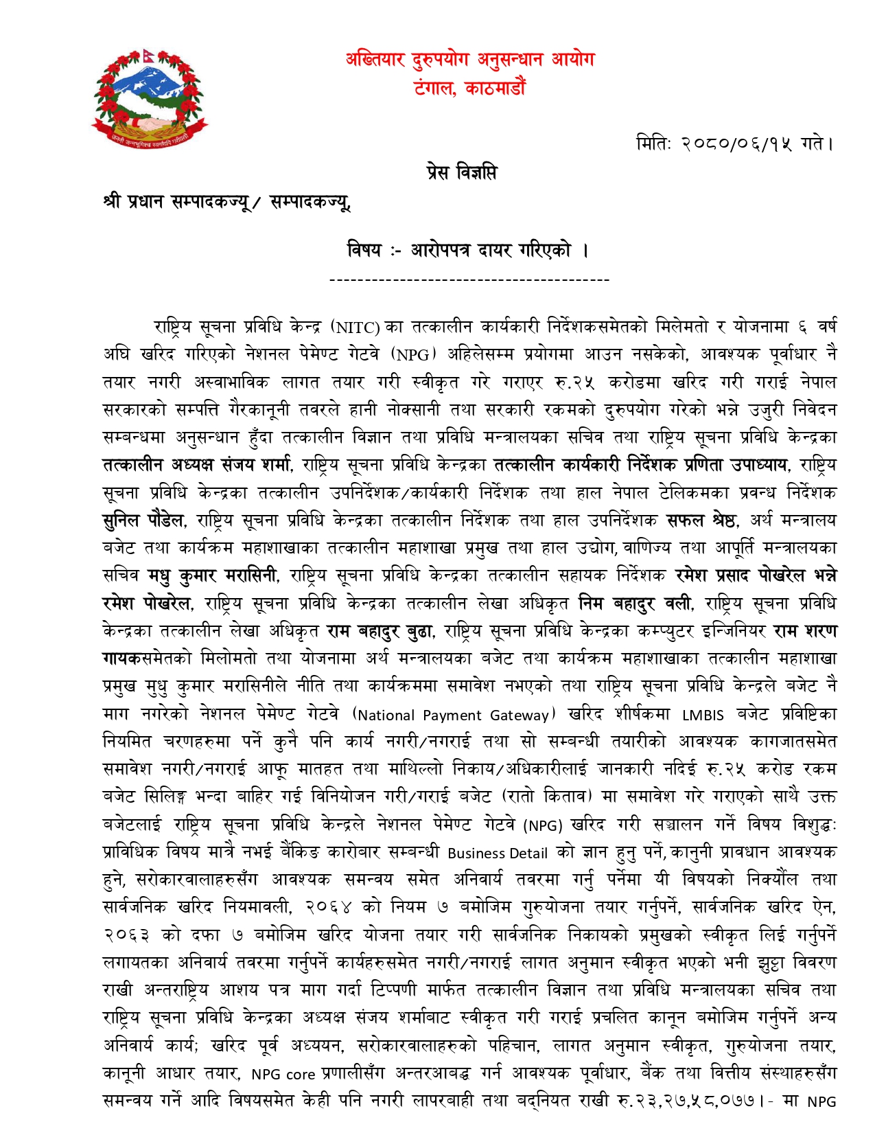 अख्तियार दुरुपयोग अनुसन्धान आयोगले सचिव मरासिनीसहित राष्ट्रिय सूचना प्रविधि केन्द्रका अध्यक्ष र कार्यकारी निर्देशकविरुद्ध नेशनल पेमेन्ट गेटवे प्रकरणमा सोमबार विशेष अदालतमा अभियोगपत्र दायर गरेको छ ।