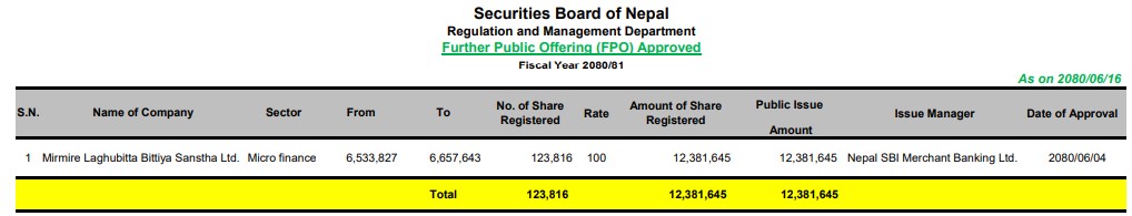 मिर्मिरे लघुवित्तले १ करोड २३ लाख ८१ हजार ६४५ रुपैयाँ बराबरको एफपीओ जारी गर्नेछ । जसअनुसार संस्थाले १०० अंकित दरका कुल १ लाख २३ हजार ८१६ कित्ता एफपीओ बिक्रीमा ल्याउनेछ ।