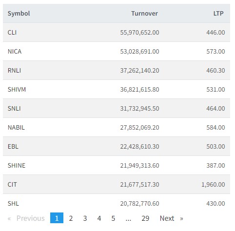 त्यस्तै, रिलायबल नेपाल लाइफ, शिवम सिमेन्टस, सन नेपाल लाइफ, नबिल बैंक, एभरेष्ट बैंक, शाईन रोसुङ्गा बैंक, सिआईटी र सोल्टि होटलको आज सर्वाधिक कारोबार भएको छ।