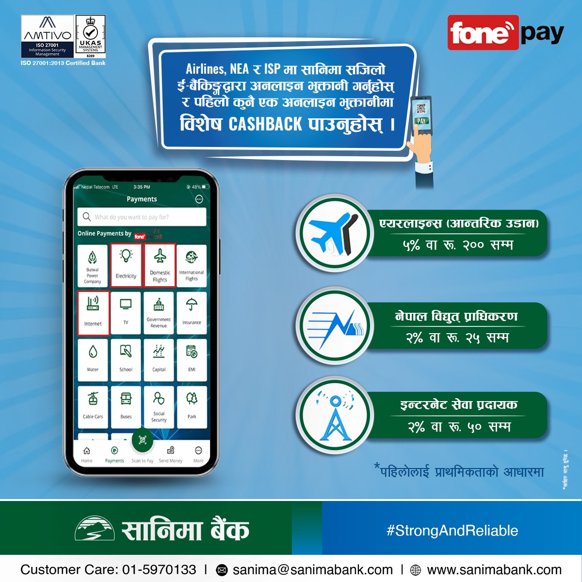 काठमाडौं । सानिमा बैंक र फोनपे प्रालिको सहकार्यमा सानिमा सजिलो इबैंकिङ्ग सेवा प्रयोगकर्ताका लागि विशेष क्यासब्याक योजना ल्याएको छ । यो योजना कार्तिक मसान्त २०८० सम्म लागू हुने बैंकले जनाएको छ ।