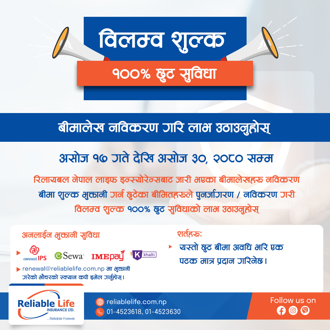 रिलायबल लाइफको बीमालेख नवीकरण गर्दा विलम्ब शुल्कमा शतप्रतिशत छुट