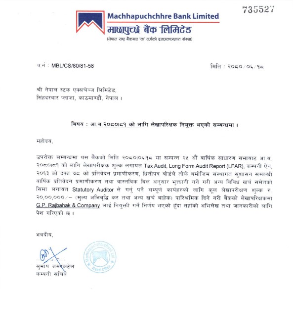माछापुच्छ्रे बैंकको लेखापरीक्षकमा जीपी राजबाहक एण्ड कम्पनी नियुक्त