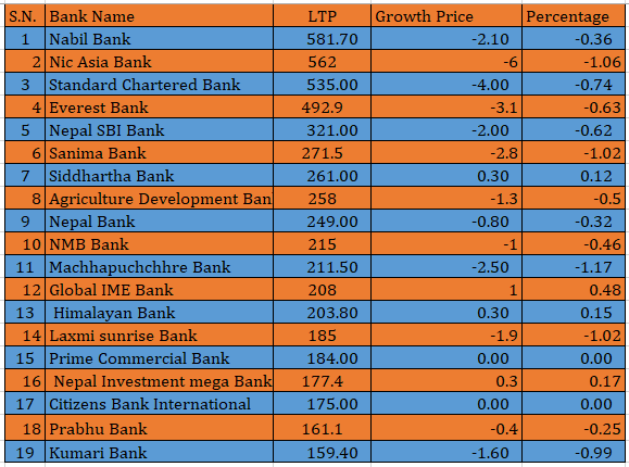 बैंकमध्ये सबैभन्दा धेरै शेयर मूल्य नबिल बैंकको रहेको छ । बिहीबार बैंकको शेयरमूल्य ५८१ रुपैयाँ रहेको थियो । यसका साथै, एनआइसी एशिया बैंकको ५६२ रुपैयाँ, स्ट्याण्डर्ड चार्टड बैंकको ५३२ रुपैयाँ रहेको छ । कुमारी बैंक, प्रभु बैंक, नेपाल इन्भेष्टमेन्ट बैंक लगायतको शेयरमूल्य सबैभन्दा कम रहेको छ ।