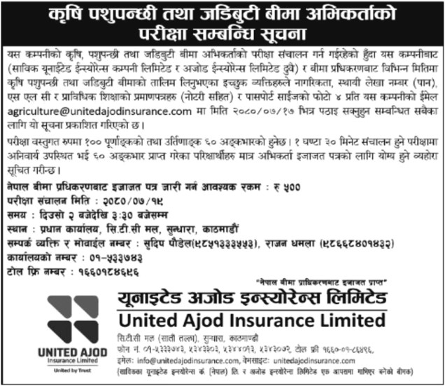 काठमाडौं । युनाइटेड अजोड इन्स्योरेन्स कम्पनी लिमिटेडले कृषि पशुपन्छी तथा जडिबुटी बीमा अभिकर्ता परीक्षा सञ्चालन गर्ने भएको छ ।