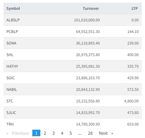 त्यस्तै, सोनापुर, सोल्टि होटल,हाथवे, सानिमा जिआईसी, नबिल बैंक, साल्ट टेडिङ, सूर्य ज्योति लाइफ र तारागाँउ रिजेन्सीको सर्वाधिक कारोबार भएको छ।