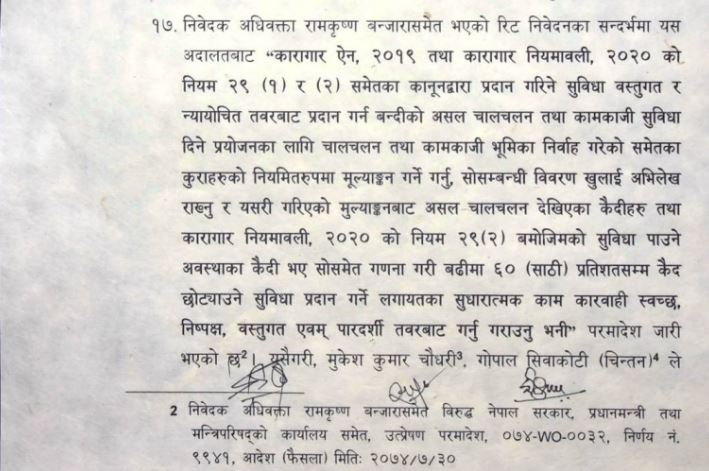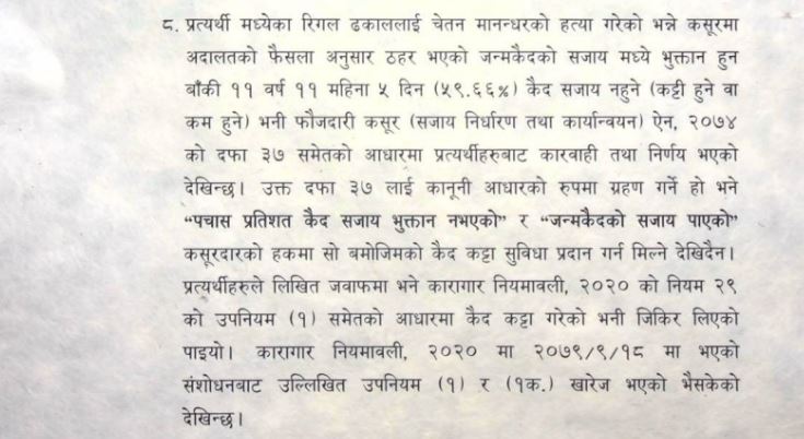 सरकारले भने सर्वोच्च अदालतको एउटा फैसलालाई नजिर मानेर यो पल्टको संविधान दिवसमा ४० प्रतिशत कैद भुक्तान गरेका बन्दीहरूको अलग्गै लागतको कैद मिनाहा तोक्यो ।