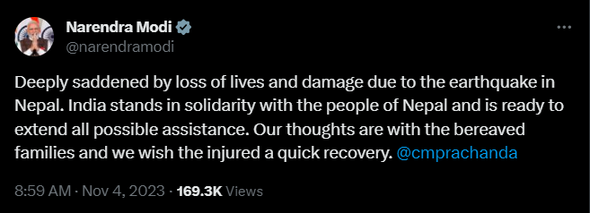 जाजरकोटमा मध्यरातमा ६.४ रेक्टर स्केलको भूकम्प गएपछि भएको जनधनको क्षतिको खबर थाहा पाएपछि भारतीय प्रधानमन्त्री मोदीले ट्वीटरमार्फत यस्तो प्रतिवद्धता जनाए । आफ्ना नेपाली समकक्षी प्रधानमन्त्री प्रचण्डलाई मेन्सन गर्दै ट्वीटमार्फत उनले भनेका छन्, ‘भारत नेपाली जनतासँग ऐक्यबद्धतामा उभिएको छ र सबै सम्भव सहयोग गर्न तयार छ। हाम्रो साथ शोकसन्तप्त परिवारसँग छ र घाइतेहरूको शीघ्र स्वास्थ्यलाभको कामना गर्दछौं।’