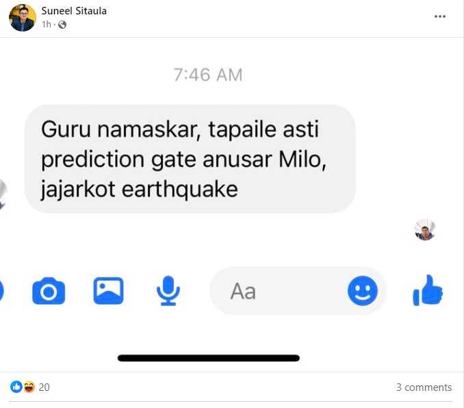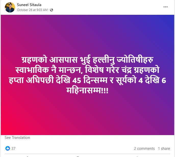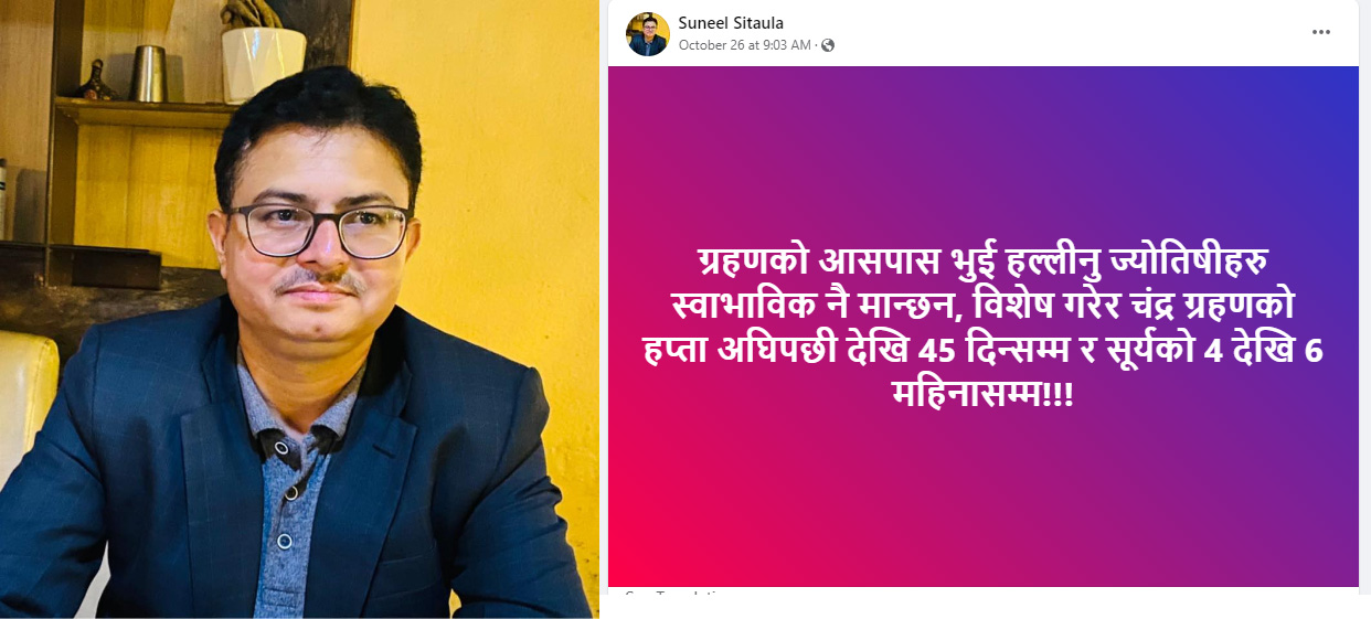 ज्योतिष डा. सुनिल सिटौलाले यही कार्तिक ९ गते राखेको स्टाटस कार्तिक ११ गतेको चन्द्रग्रहण सम्बन्धी थियो । जसमा एक सातादेखिसम्म भुकम्पको जोखिम रहेको उल्लेख छ । उनले आज विहान सामाजिक सञ्जालमा शुभचिन्तकले दिएको सुझाव समेत शेयर गरेका छन् । जसमा भुकम्पको पूर्वानुमान गतेसहित मिलाएको उल्लेख छ ।
