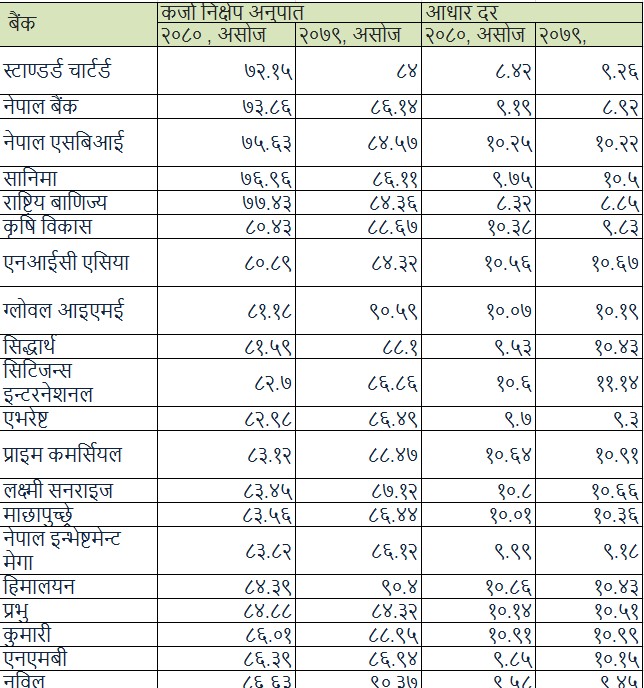 यस्तै कृषि विकास बैंकको सीडी अनुपात ८०.४३ प्रतिशत, ग्लोबल आईएमई बैंकको ८१.१८ प्रतिशत, सिद्धार्थ बैंकको ८१.५९ प्रतिशत, सिटिजन्स बैंक इन्टरनेशनलको ८२.७ प्रतिशत, एभरेष्ट बैंकको ९२.९८ प्रतिशत, प्राइम कमर्सियल बैंकको ८३.१२ प्रतिशत, लक्ष्मी सनराइज बैंकको ८३.५६ प्रतिशत, माछापुच्छ्रे बैंकको ८३.५६ प्रतिशत, नेपाल इन्भेष्टमेन्ट मेगा बैंकको ८३.८२ प्रतिशत, हिमालयन बैंकको ८४.३९ प्रतिशत र प्रभु बैंकको ८४.८८ प्रतिशत रहेको छ।