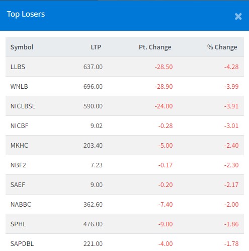 त्यस्तै आज, एनआईसी एशिया ब्यालेन्स्ड फण्ड, माया खोला हाइड्रोपावर, नबिल ब्यालेन्स्ड फण्ड–२, सानिमा इक्विटी फण्ड, नारायणी विकास बैंक, सयपत्री हाइड्रोपावर र सप्तकोशी विकास बैंकको शेयरमूल्य सर्वाधिक घटेको छ ।