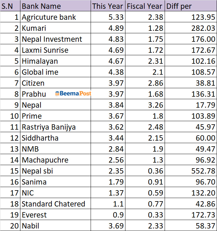 राष्ट्र बैंकका अनुसार नेपाल बैंकको ६२ प्रतिशतले बढेर ३.८४ प्रतिशत, प्राइम बैंकको १०३ प्रतिशतले बढेर ३.६७ प्रतिशत, राष्ट्रिय वाणिज्य बैंकको ४५ प्रतिशतले बढेर ३.६२ प्रतिशत र सिद्धार्थ बैंकको ६० प्रतिशतले बढेर ३.४४ प्रतिशत पुगेको छ ।