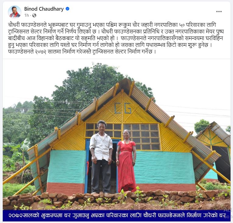 भूकम्प पीडितलाई फेरि बेकामे सेल्टर बनाउने चौधरी फाउण्डेशनको घोषणा, यस्तो छ विगतको नालीबेली