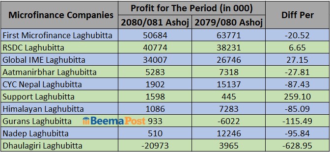 अघिल्लो आवको तुलनामा चालु आवमा हिमालयन लघुवित्तको मुनाफा ८५.०८ प्रतिशतले घटेर १० लाख ८६ हजार रुपैयाँ रहेको छ । त्यसैगरी गुराँस लघुवित्त, नाडेप लघुवित्त र धौलागिरी लघुवित्तको मुनाफा अघिल्लो आवको तुलनामा चालु आवमा घटेको छ ।
