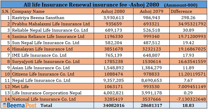 त्यस्तै, सूर्यज्योति, एशियन, सानिमा रिलायन्स, सिटिजन र मेट लाइफले नविकरण शुल्क मार्फत एक अर्बमाथि रहेको छ । प्रभु महालक्ष्मी लाइफले ९३ करोड ५६ लाख रुपैयाँ, आइएमई लाइफले ७६ करोड रुपैयाँ, रिलायबल नेपालले ६८ र सन नेपालले ५८ करोड रुपैयाँमाथि नविकरण बीमाशुल्क आर्जन गरेको छ ।