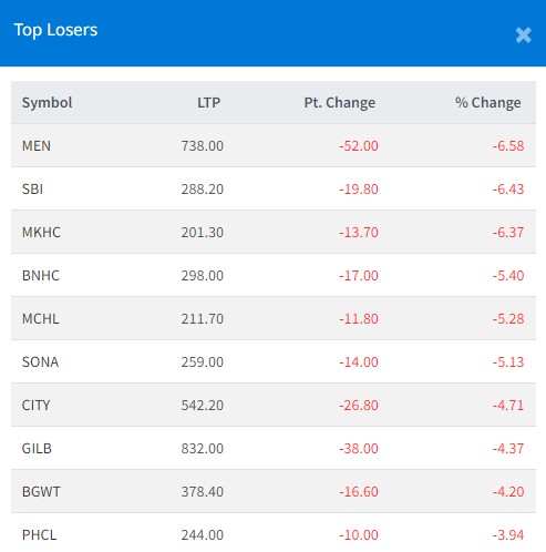 त्यस्तै आज, बुद्ध भूमि नेपाल हाइड्रोपावर, मेन्छियाम हाइड्रोपावर, सोनापुर मिनरल्स, सिटी होटल, ग्लोबल आईएमई लघुवित्त, भगवती हाइड्रोपावर डेभलपमेन्ट कम्पनी र पिपुल्स हाइड्रोपावर कम्पनीको शेयरमूल्य सर्वाधिक घटेको छ ।