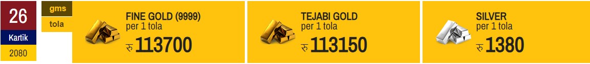 नेपाली बजारमा आज छापावाल सुनको मूल्य प्रतितोला १ लाख १३ हजार ७००रुपैया र तेजावी सुनको मूल्य १ लाख १३ हजार १५० रुपैयाँमा कारोबार भइरहेको छ ।