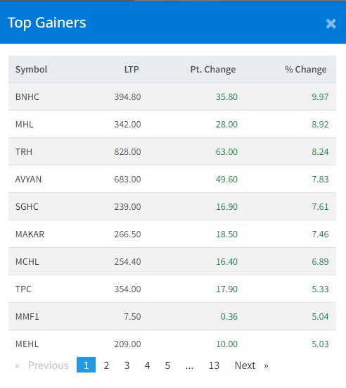 शेयर बजार घटेतापनि आज १०२ कम्पनीको शेयरमूल्य बढेको छ । मंगलबार मन्दाकीनी हाइड्रोपावरको शेयरमूल्य ८.९२ प्रतिशतले सर्वाधिक बृद्धि भएको छ ।