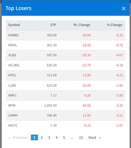 शेयर बजार घटेसँगै नारायणी डेभलपमेन्ट बैंकको शेयरमूल्य ५.३३ प्रतिशतले सर्वाधिक घटेको छ । त्यस्तै, मंगलबार मिड सोलु हाइड्रोपावरको ४.७५ प्रतिशत, विजया लघुवित्तको ४.६७ प्रतिशत, आरम्भ चौतारी लघुवित्त लगायतका कम्पनीको शेयरमूल्य घटेको छ ।