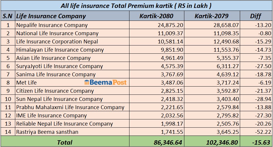 गत वर्षको कात्तिक महिनामा १० अर्ब २३ करोड ४६ लाख रुपैयाँ कुल बीमा शुल्क आर्जन गरेको जीवन बीमा कम्पनीको चालु आवको सोही अवधिमा १५.६३ प्रतिशतले कुल बीमा शुल्क आर्जन घटेको हो ।