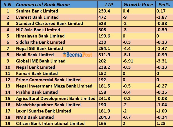 वाणिज्य बैंकहरुको शेयर १५२ देखि ५२३ रुपैयाँ पाईने, पाँचबाहेक सबैको शेयर मूल्यमा गिरावट