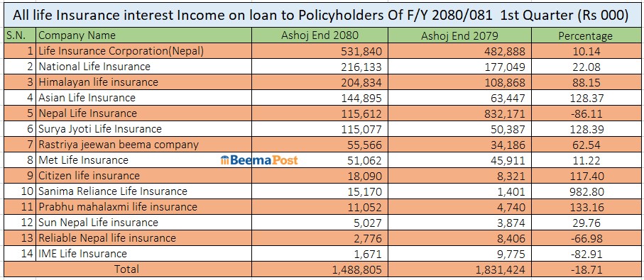 चालु आर्थिक वर्षको तीन महिनामा सञ्चालित १४ जीवन बीमा कम्पनीहरुले बीमितहरुलाई एक अर्ब ४८ करोड ८८ लाख रुपैयाँ बराबरको बीमालेख धितोकर्जा प्रदान गरेका छन् । गत आवको सोही अवधिमा बीमितहरुले एक अर्ब ८३ करोड रुपैयाँ बराबरको बीमालेख धितोकर्जा वापतको सुबिधा पाएका थिए ।