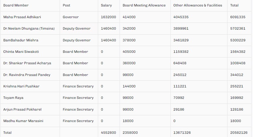 त्यस्तै डेपुटी गभर्नर निलम ढुंगानाले ५७ लाख २ हजार बुझेका छन् । भने अर्का डेपुटी गभर्नर बम बहादुर मिश्रले ५३ लाख भत्ता बुझेका छन् ।