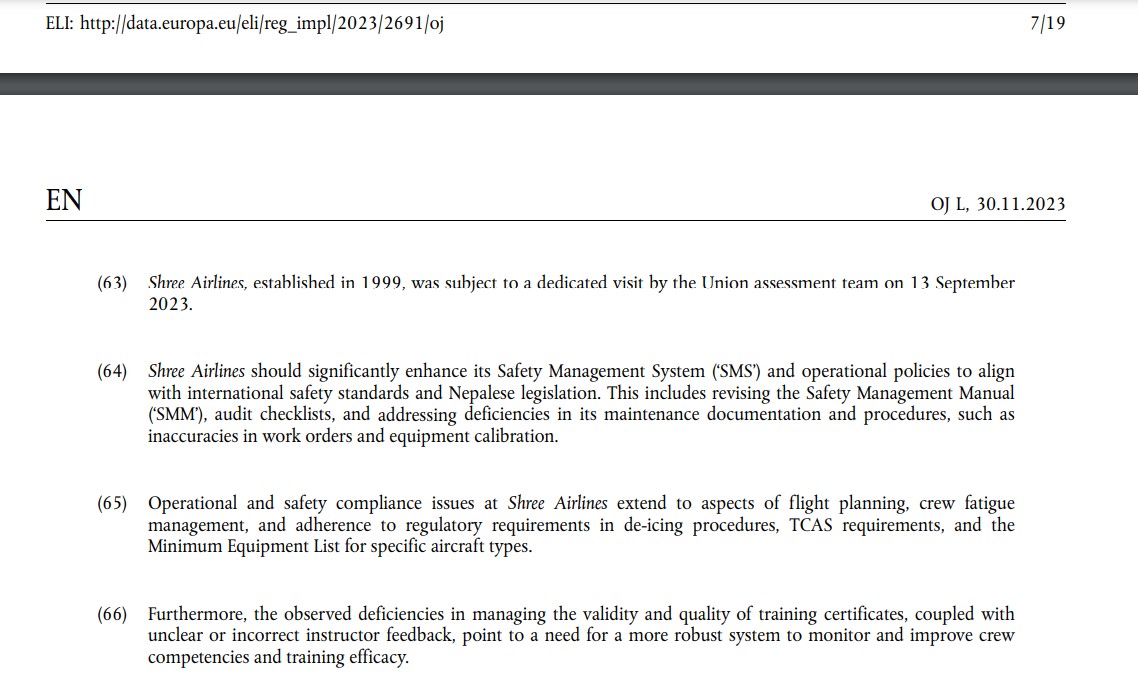 इयु युरोपेली देशहरुको हवाई नियामक निकायले नेपालको सन्दर्भमा यस्तो सुझाव दिएको हो । साथै इयुले युरोप जाने जहाजहरुलाई इराकको राजधानी बग्दाद भएर उड्न रोक लगाउने निर्णय गरेको छ । इयुको एभियशन सेफ्टी एजेन्सीले श्री एयरलाइन्सको विषयमा यति गम्भिर विषयमाथि प्रश्न उठाउँदै टिप्पणी गरिसकेपछि पनि नेपालको नागरिक उड्डयन प्राधिकरण भने मौन जस्तै देखिएको छ ।