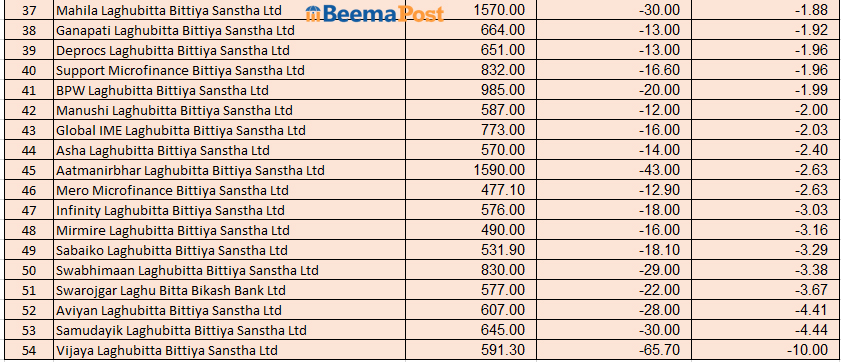 नेप्सेका अनुसार बिहीबार कारोबार भएका ५४ लघुवित्त कम्पनीहरुमध्ये ११ वटाको बढेको छ र ४१ कम्पनीको घटेको छ । साथै, २ कम्पनीको चाही सोही मूल्यमा शेयर कारोबार भएको छ ।