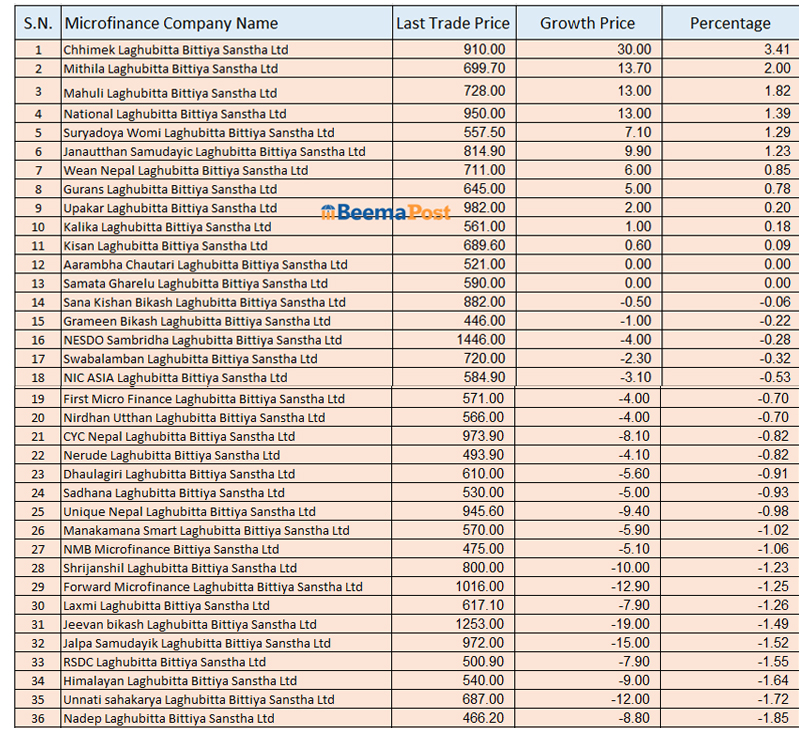 बिहीबार छिमेक लघुवित्तको ३.४१ प्रतिशतले सर्वाधिक बृद्धि भएको छ । त्यस्तै, मिथिल्ला लघुवित्तको २, महुली लघुवित्त लगायतका कम्पनीको शेयरमुल्य बढेको छ ।