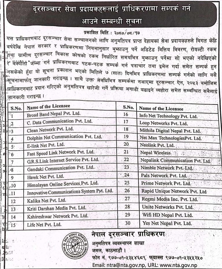 दूरसञ्चार प्राधिकरणले सार्वजनिक सूचना नै जारी गरेर ७ दिनभित्र सम्पर्कमा ३० नआए लाइसेन्स नै खारेज गरिदिने चेतावनी दिएको छ ।