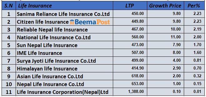 त्यस्तै, सानिमा रिलायन्स लाइफको २.२३, रिलायबल नेपाल लाइफको २.१९, नेशनल लाइफको २ र नेपाल लाइफको ०.१५ प्रतिशतले शेयरमूल्य बृद्धि भएको छ ।