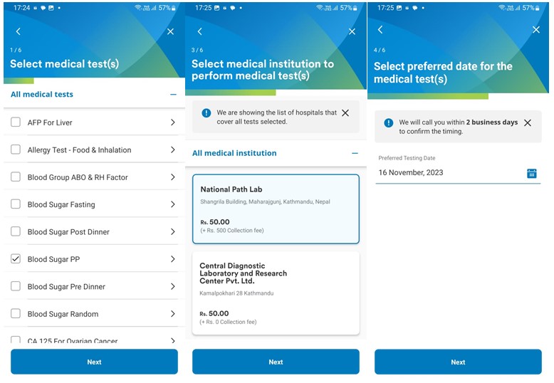 एप प्रयोगकर्ताहरुले मोबाइल एप मार्फत रगत परिक्षण, दिशापिसाब परिक्षण, ज्वरो, कलेजो परिक्षण लगायतका ५० प्रकारका परिक्षण सेवा घरमै बसी बसी लिन सक्ने सुविधा दिएको छ । यो सुविधा अन्तर्गत प्रयोगकर्ताहरुले आफूले चाहेको परिक्षणका लागी एट होम मेडिकल टेष्ट सुविधा अन्तर्गत घरमै बसेर जाँच गराउन सक्ने सुविधा रहेको मेटलाइफले जानकारी दिएको छ । यो सुविधाका लागी मेटलाइफले मान्यता प्राप्त प्रयोगशाला र चिकित्सकसँग व्यवसायीक सम्झौता गरेको छ ।