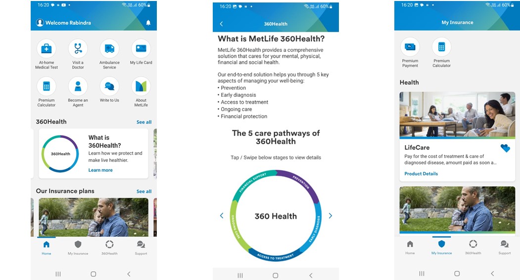 ३६० हेल्थ सेवा अन्तर्गत मेटलाइफले रोग रोकथाम, प्रारम्भिक निदान, उपचार, र निरन्तर हेरचाह, वित्तीय सुरक्षा र स्वस्थ जीवनशैलीलाई व्यवहारमा परिवर्तन गर्ने लक्ष्य राखेको छ । मेटलाइफले एउटै बीमालेख अन्तर्गत विभिन्न परिक्षणहरू, चिकित्सकीय परामर्श, औषधी उपचार, लगायतको सेवा उपलब्ध गराएको छ । यसबाहेक अन्य जीवन बीमालेख खरिद गर्नका लागी बीमितले र इच्छुक व्यक्तिहरुले प्रस्ताव फारम भर्न सक्ने सुविधा पनि मेटलाइफको एप मार्फत नै सम्भव छ।