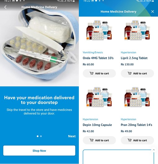 यो सुविधाले प्रयोगकर्ताहरूलाई उनीहरूको घरबाट अनलाइन औषधि खरिद गर्न अनुमति दिन्छ । प्रयोगकर्ताहरूले यस एपबाट औषधि खरिदमा १२% छुट प्राप्त गर्न सक्नेछन् । तर, चिकित्सकले तोकेका औषधिका लागि ग्राहकले घरमै औषधि लिँदा आफ्नो प्रिस्क्रिप्शन देखाउनुपर्ने हुन्छ ।