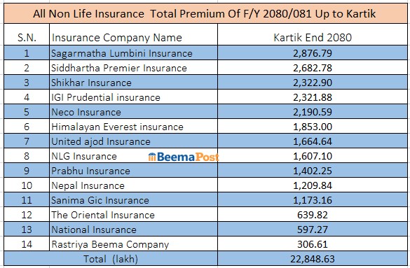 नेपाल बीमा प्राधिकरणले सार्वजनिक गरेको तथ्यांक अनुसार हाल संचालनमा रहेका निर्जिवन बीमा कम्पनीहरुले कात्तिक महिनामा २ लाख १० हजार ८८ वटा बीमा पोलिसी जारी गरेर २ अर्ब २९ करोड २४ लाख रुपैयाँ कुल बीमाशुल्क आर्जन गर्न सफल भएका हुन् ।