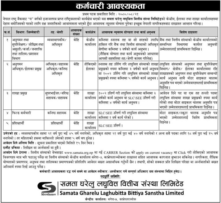 काठमाडौं । समता घरेलु लघुवित्तले कर्मचारी माग गरेको छ । कम्पनीले केन्द्रीय, ईलाका तथा शाखा कार्यालयहरुमा काम गर्नका लागि विभिन्न पदहरुमा आवेदन खुलाएको हो ।