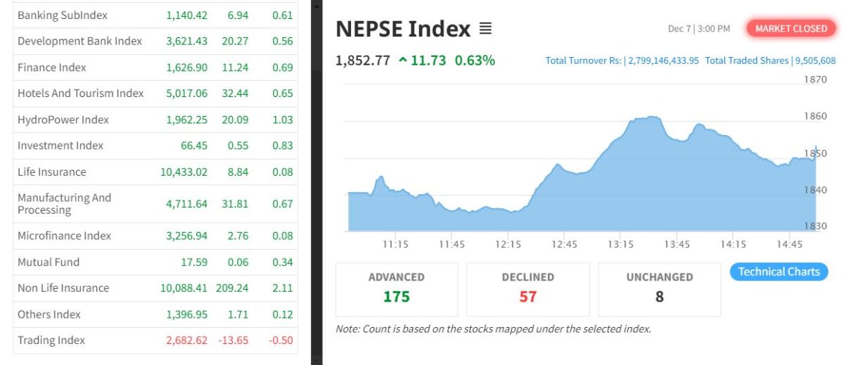 काठमाडौं । साताको अन्तिम कारोबार दिन शेयर बजार परिसूचक नेप्से ११.७३ अंकले बढेर १८५२.७७ विन्दुमा पुगेर रोकिएको छ । अघिल्लो दिन वुधबार नेप्से ३.३३ अंकले बढेर १८४१.०४ विन्दुमा पुगेको थियो । बिहीबार ९५ लाख ५६ हजार कित्ता शेयर किनबेच हुँदा दुई अर्ब ७९ करोड ९१ लाख ४६ हजार ४३३ रुपैयाँको कारोबार भएको छ ।