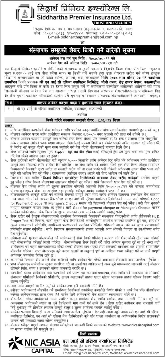 सिद्धार्थ प्रिमियरको ५ लाख ३३ हजार कित्ता संस्थापक शेयर बिक्रीमा, न्यूनतम मूल्य कति ?