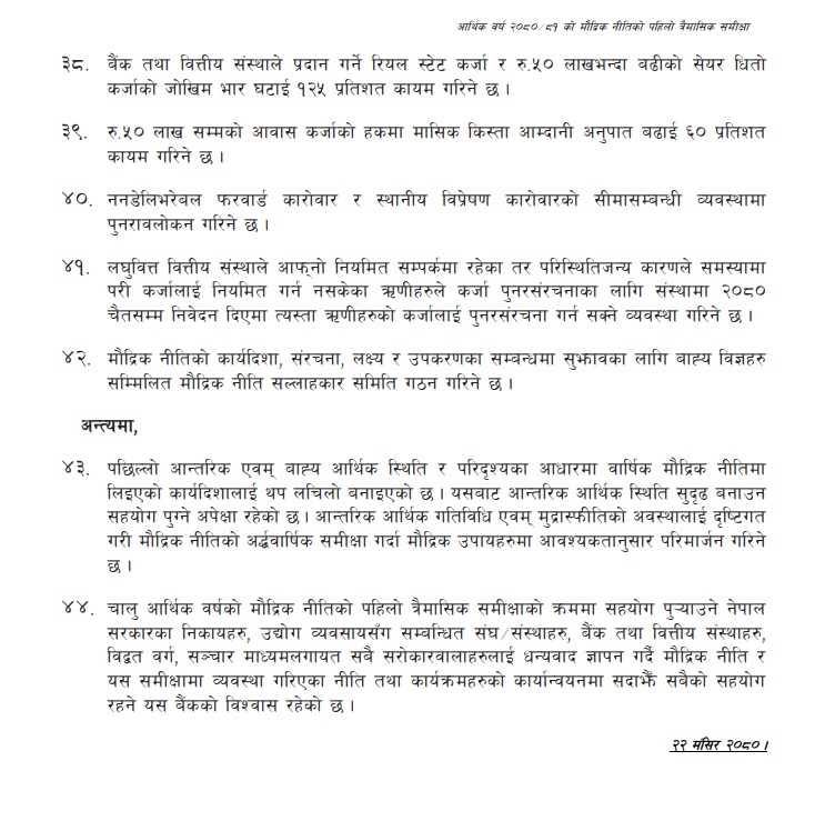 मौद्रिक नीति सार्वजनिक, घरजग्गा र शेयर कर्जाको जोखिमभार घटाइयो (पूर्णपाठसहित)