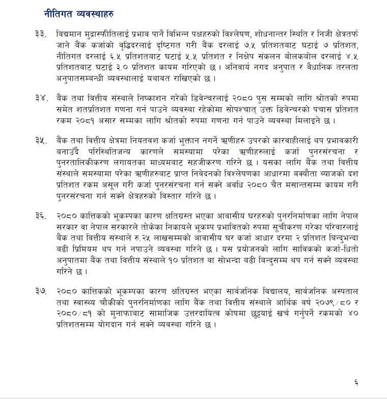 मौद्रिक निितमा विद्यमान मुद्रास्फीतिलाई प्रभाव पार्ने विभिन्न पक्षहरुको विश्लेषण, शोधनान्तर स्थिति र निजी क्षेत्रतर्फ जाने बैंक कर्जाको वृद्धिदरलाई दृष्टिगत गरी बैंक दरलाई ७.५ प्रतिशतबाट घटाई ७ प्रतिशत, नीतिगत दरलाई ६.५ प्रतिशतबाट घटाई ५.५ प्रतिशत र निक्षेप संकलन बोलकबोल दरलाई ४.५ प्रतिशतबाट घटाई ३.० प्रतिशत कायम गरिएकोछ । अनिवार्य नगद अनुपात र वैधानिक तरलता अनुपातसम्बन्धी व्यवस्थालाई यथावत राखिएको छ ।