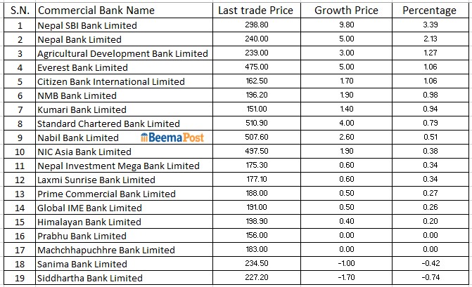 बिहीबार शेयर बजार बढेसँगै बैंकिङ्ग उपसूचक सबैभन्दा बढी अंकले बृद्धि भएको छ । यो दिन बैंकिङ्ग उपसूचक ०.६१ प्रतिशत अर्थात ६.९४ अंकले बढेर ११४०.४२ को विन्दुमा कायम भएको छ । कारोबार भएका बैंकहरुमध्ये १५ बैंकहरुको शेयरमूल्य बढेको छ । जसमा २ बैंकको शेयरमूल्य घटेको र २ बैंकको सोही मूल्यमा कारोबार भएको छ ।
