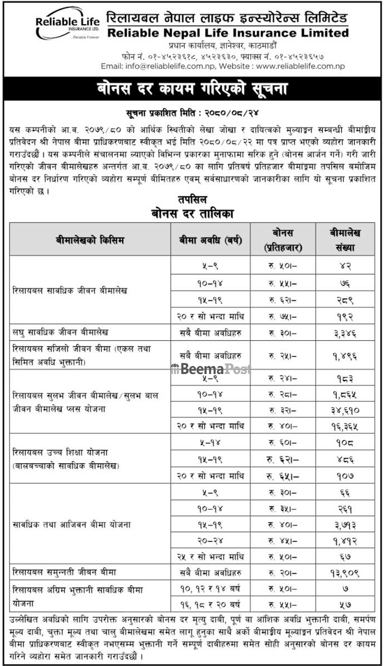 कम्पनीका अनुसार रिलायबल सावधिक जीवन बीमालेखमा न्यूनतम ५० रुपैयाँदेखि अधिकतममा ७५ रुपैयाँ प्रति वर्ष प्रति हजारका दरले बोनस पाउनेछन् । त्यस्तै, लघु सावधिक जीवन बीमालेखको सबै बीमा अवधिहरमा ३० रुपैयाँका दरले तथा रिलायबल सजिलो जीवन बीमा (एकल तथा सिमित अवधि भुक्तानी)का सबै बीमा अवधिहरुमा २५ रुपैयाँसम्म बोनस पाउनेछन् ।