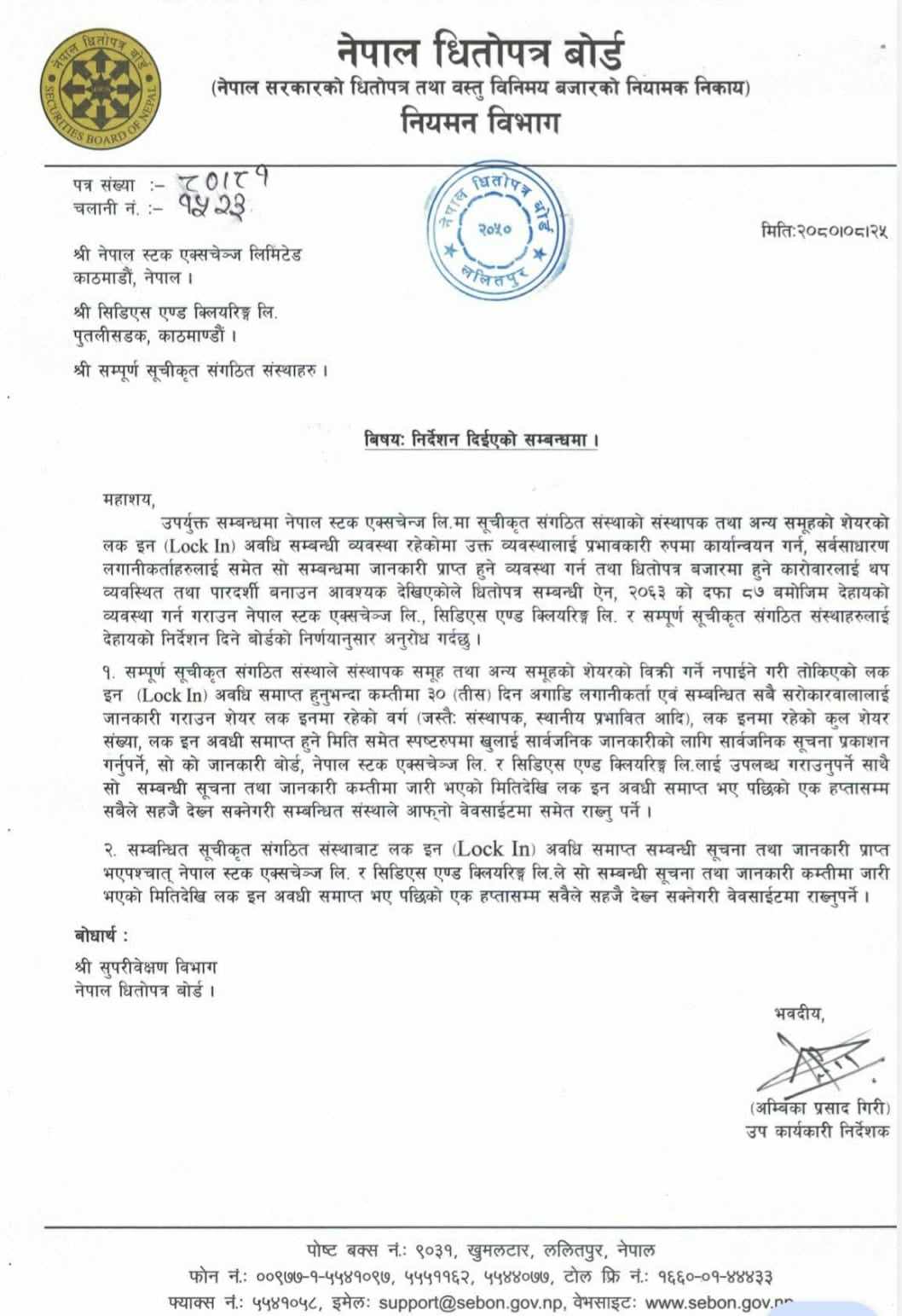 साथै, बोर्डले सूचीकृत संगठित संस्थाबाट लक इन अवधि समाप्त सम्बन्धी सूचना तथा जानकारी प्राप्त भएपश्चात् नेपाल स्टक एक्सचेञ्ज र सिडिएस एण्ड क्लियरिङ्गले सो सम्बन्धी सूचना तथा जानकारी कम्तीमा जारी भएको मितिदेखि लक इन अवधी समाप्त भए पछिको एक हप्तासम्म सवैले सहजै देख्न सक्नेगरी वेवसाईटमा राख्न समेत निर्देशन दिएको छ ।