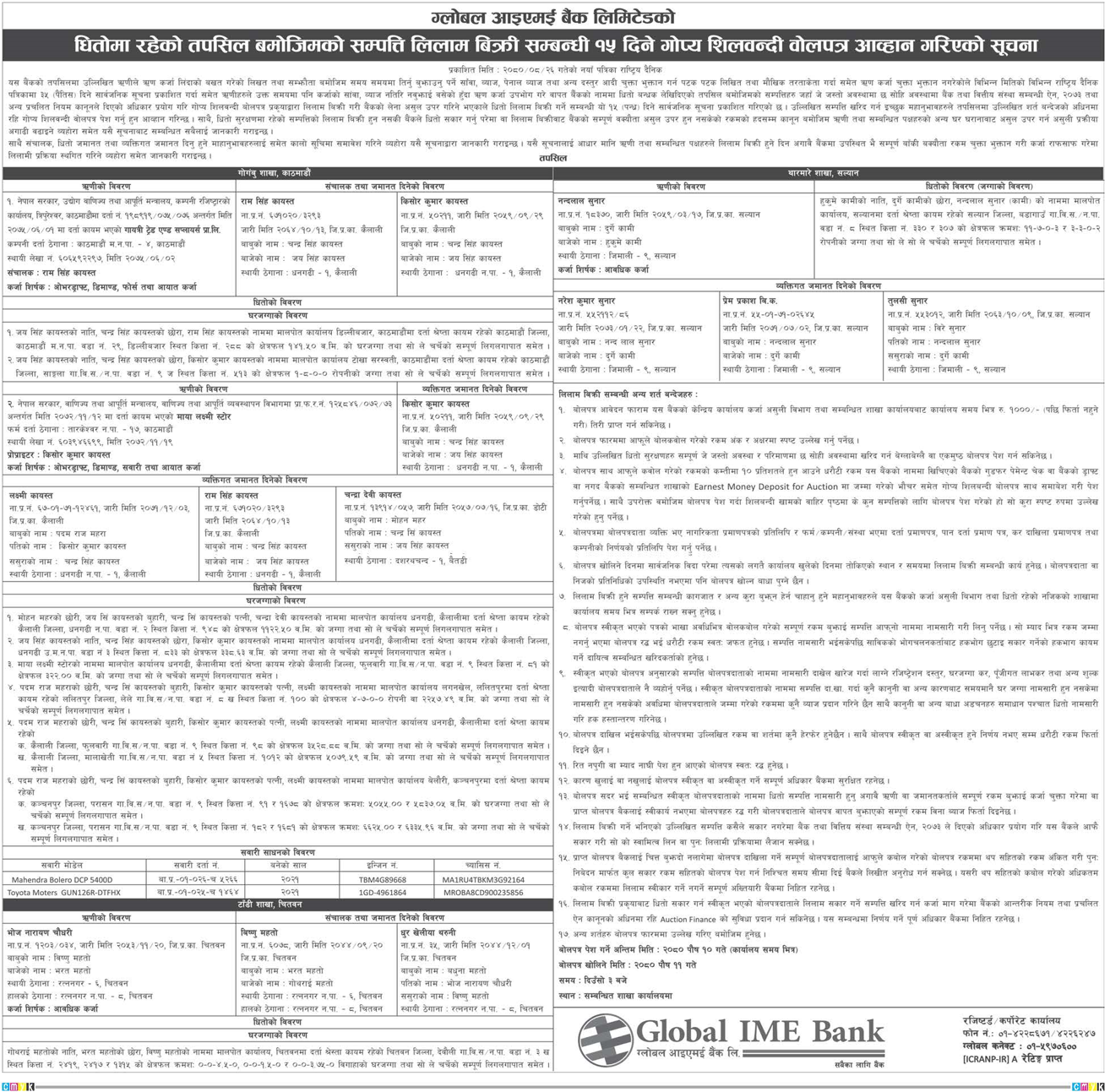 यी स्थानका घरजग्गा लिलाम बिक्री गर्दै ग्लोबल आइएमई बैंक