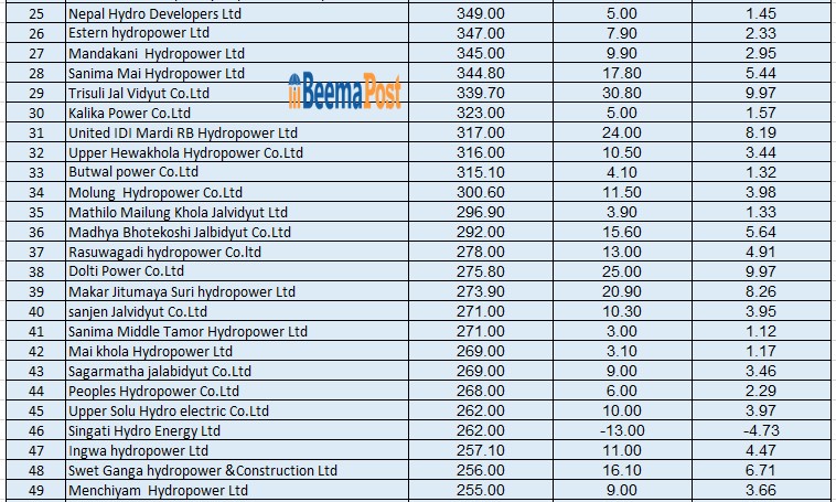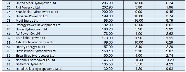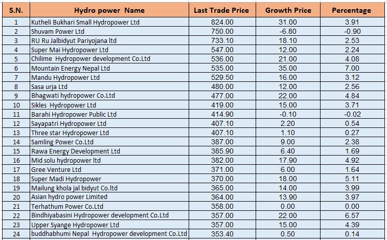 हाइड्रोपावर समुहको उपसूचक उचालिदा ८३ कम्पनीको शेयरमूल्य बढ्यो, कुनको कति ? (सूचीसहित)