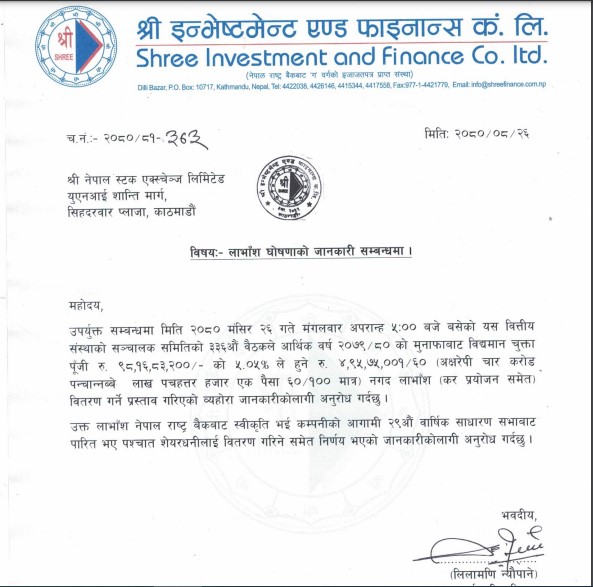 श्री इन्भेष्टमेन्ट एण्ड फाइनान्सको लाभांश घोषणा