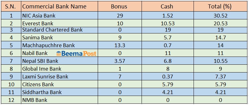 लाभांश घोषणा गरेकामध्ये एनआइसी एशिया बैंकले सबैभन्दा बढी लाभांश घोषणा गरेको हो । बैंकले शेयरधनीलाई घोषणा गरेको बोनश र नगद गरी कुल ३० दशमलव ५२ प्रतिशत लाभांश बैंकको साधारण सभाले समेत पारित गरिसकेको छ ।