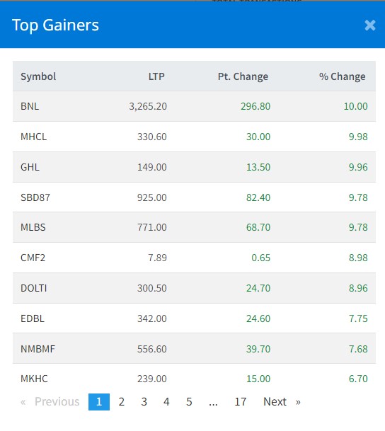 बुधबार नेप्से परिसूचक २ दशमलव ६० अंकले बढेर १९८८ दशमलव ०४ को विन्दुमा कायम भएको छ । शेयर बजार बढेसँगै आज कारोबार भएका कम्पनीहरुमध्ये १३४ कम्पनीको शेयरमूल्य बढेको छ ।