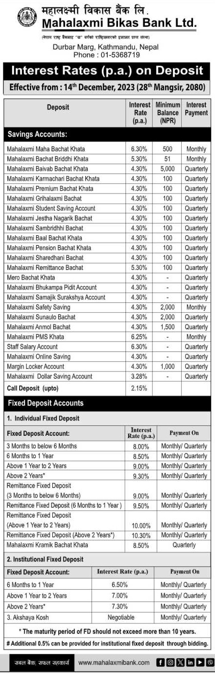 महालक्ष्मी विकास बैंकले घटायो ब्याजदर, कुनमा कति?