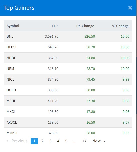 बिहीबार नेप्सेमा कारोबार भएका कम्पनीहरुमध्ये १४० कम्पनीको शेयरमूल्य बढेको छ । जसमा बोटलर्स नेपाल, हिमालयन लघुवित्त, नेपाल हाइड्रोपावर, नेपाल रिपब्लिक मिडिया, नेपाल इन्स्योरेन्स लगायतका कम्पनीको शेयरमूल्यमा सकारात्मक सर्किट लागेको छ ।